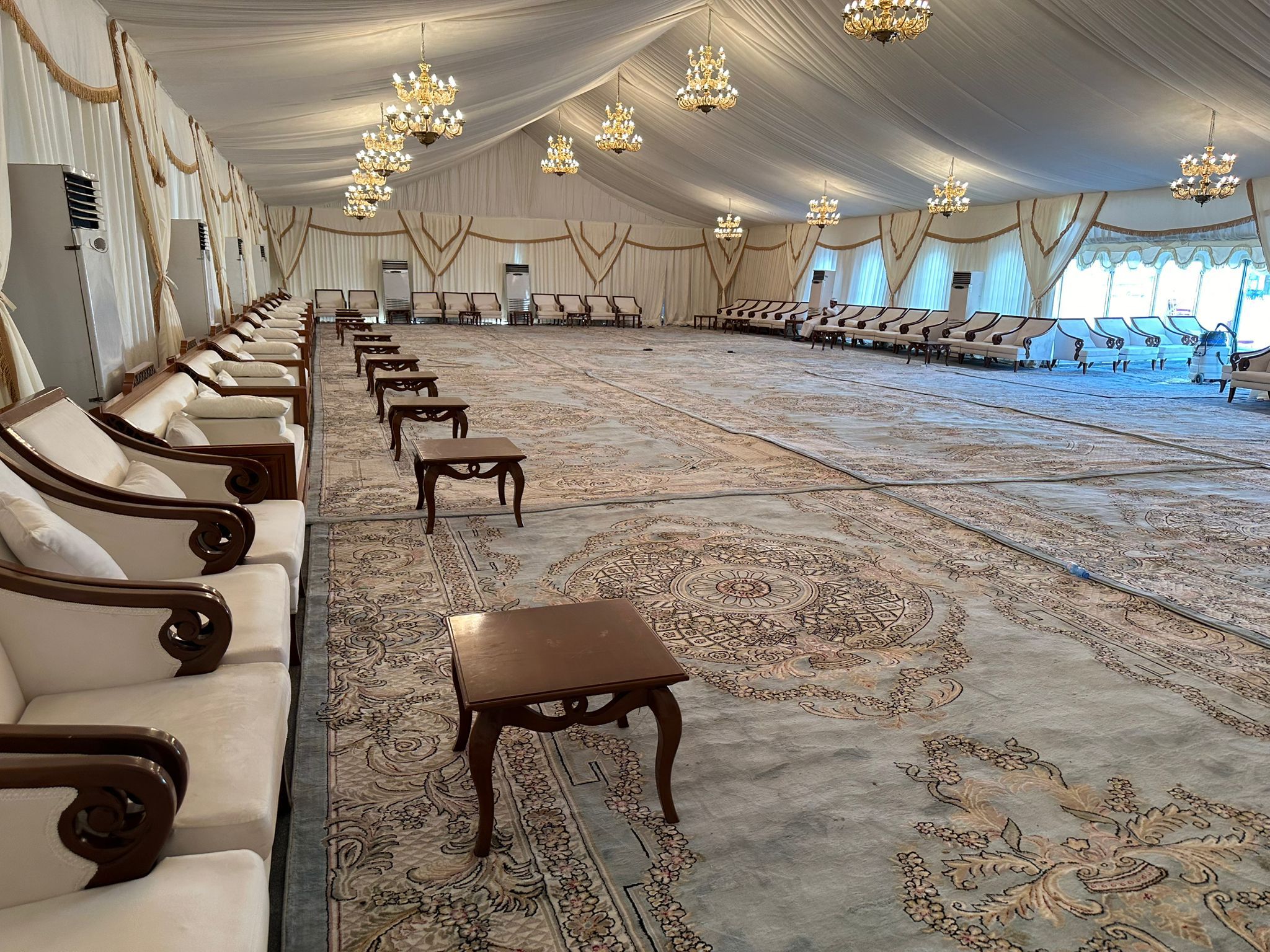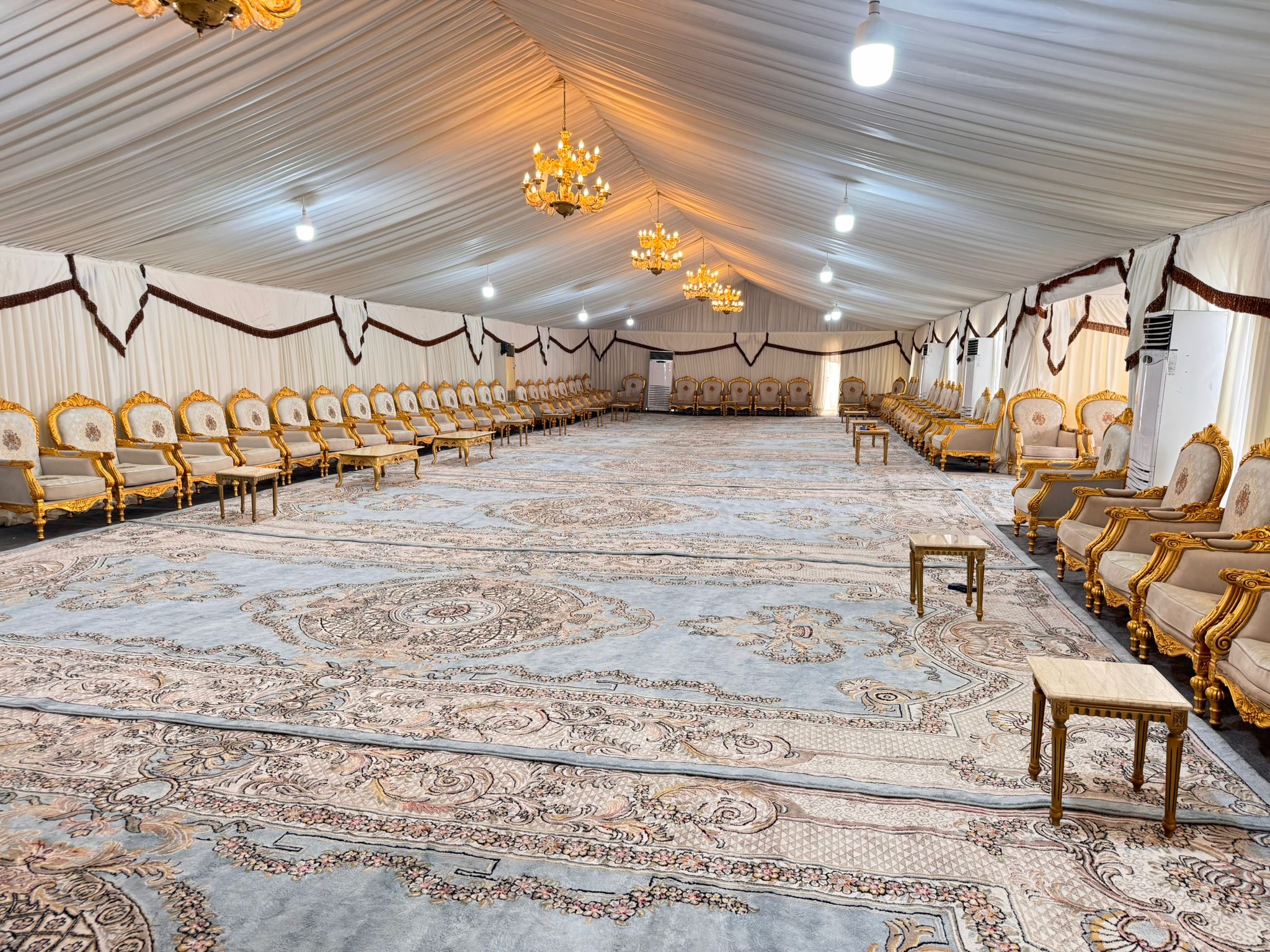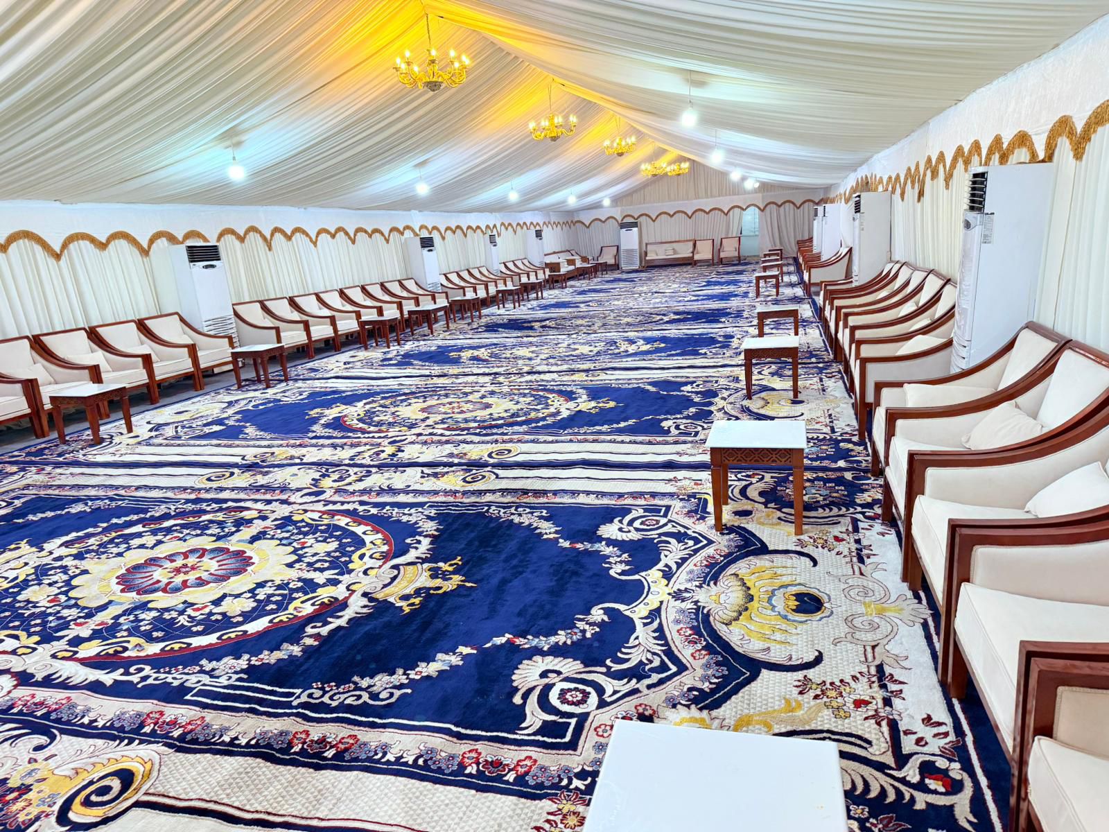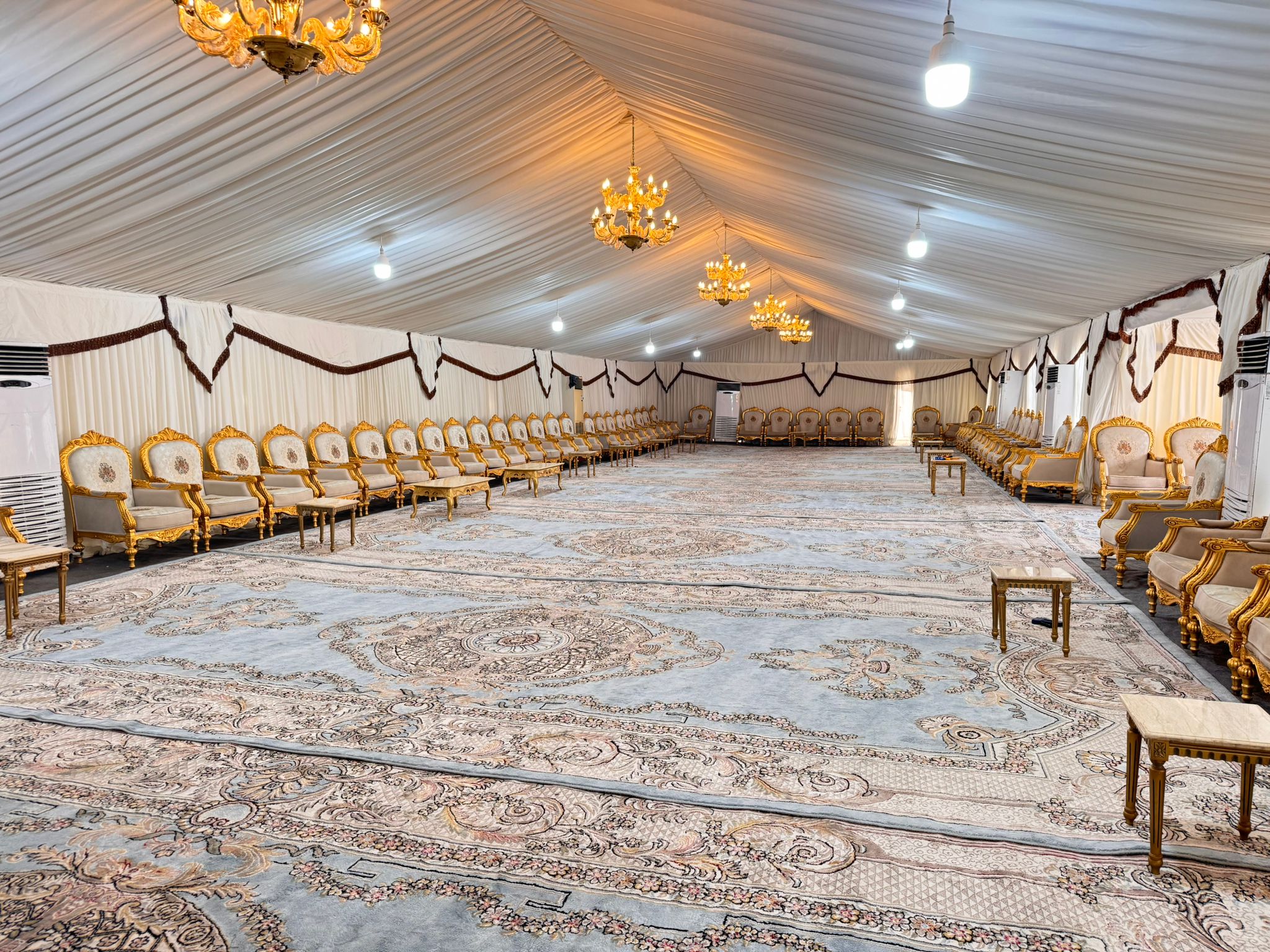تشمل الخيام كافة التجهيزات اللازمة من مقاعد، طاولات، سجاد، مكيفات، لضمان راحة الضيوف.
