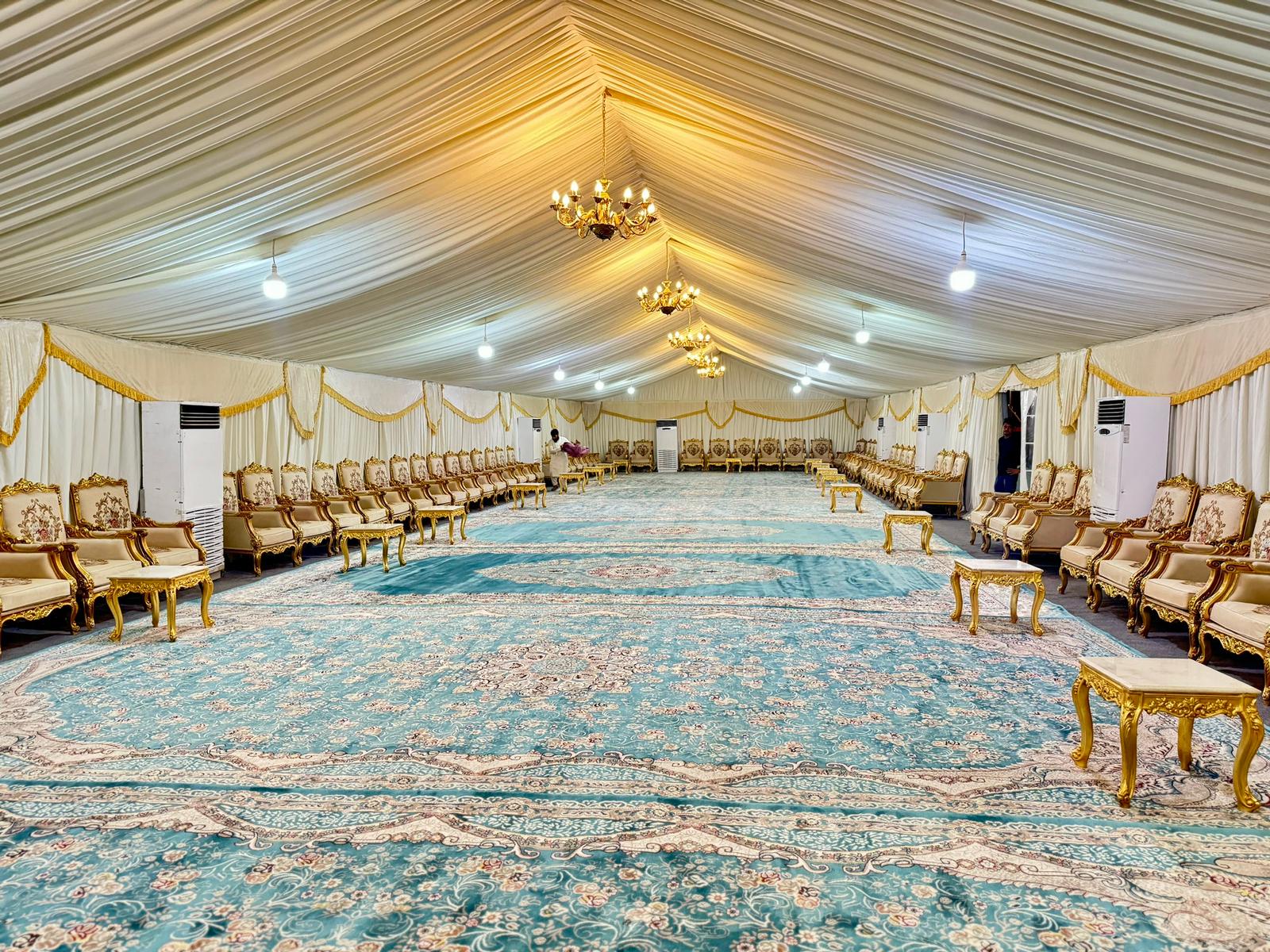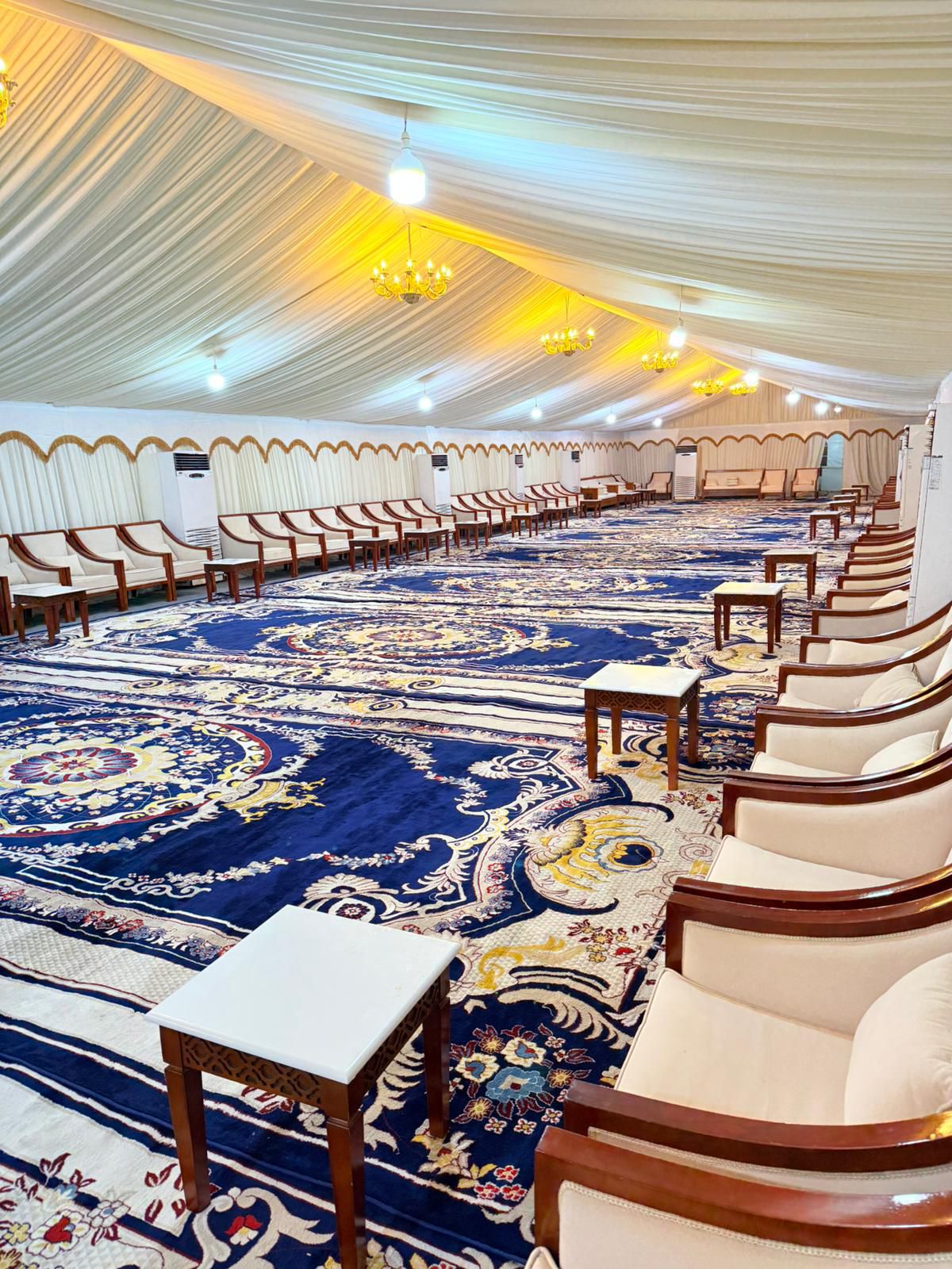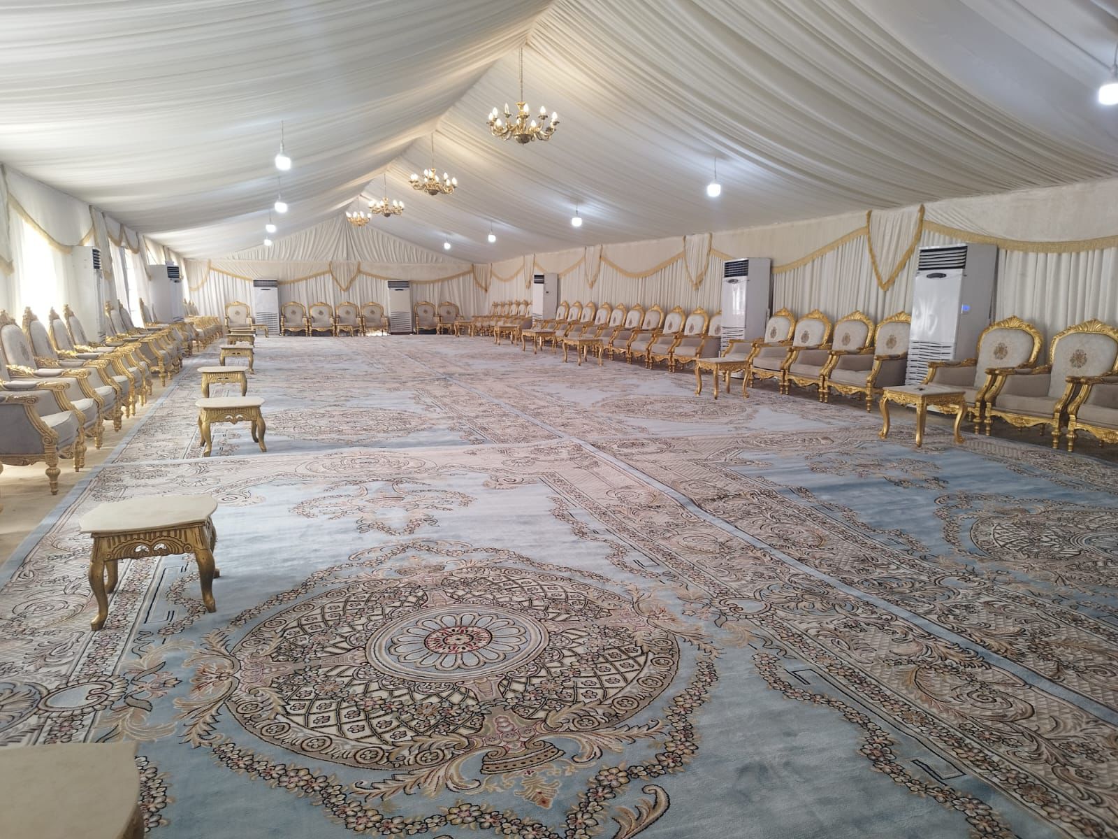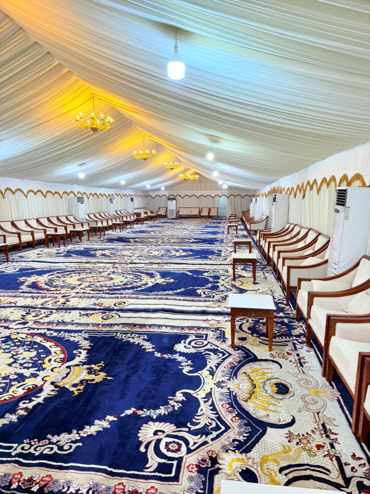 تشمل الخيام كافة التجهيزات اللازمة من مقاعد، طاولات، سجاد، مكيفات، لضمان راحة الضيوف.
