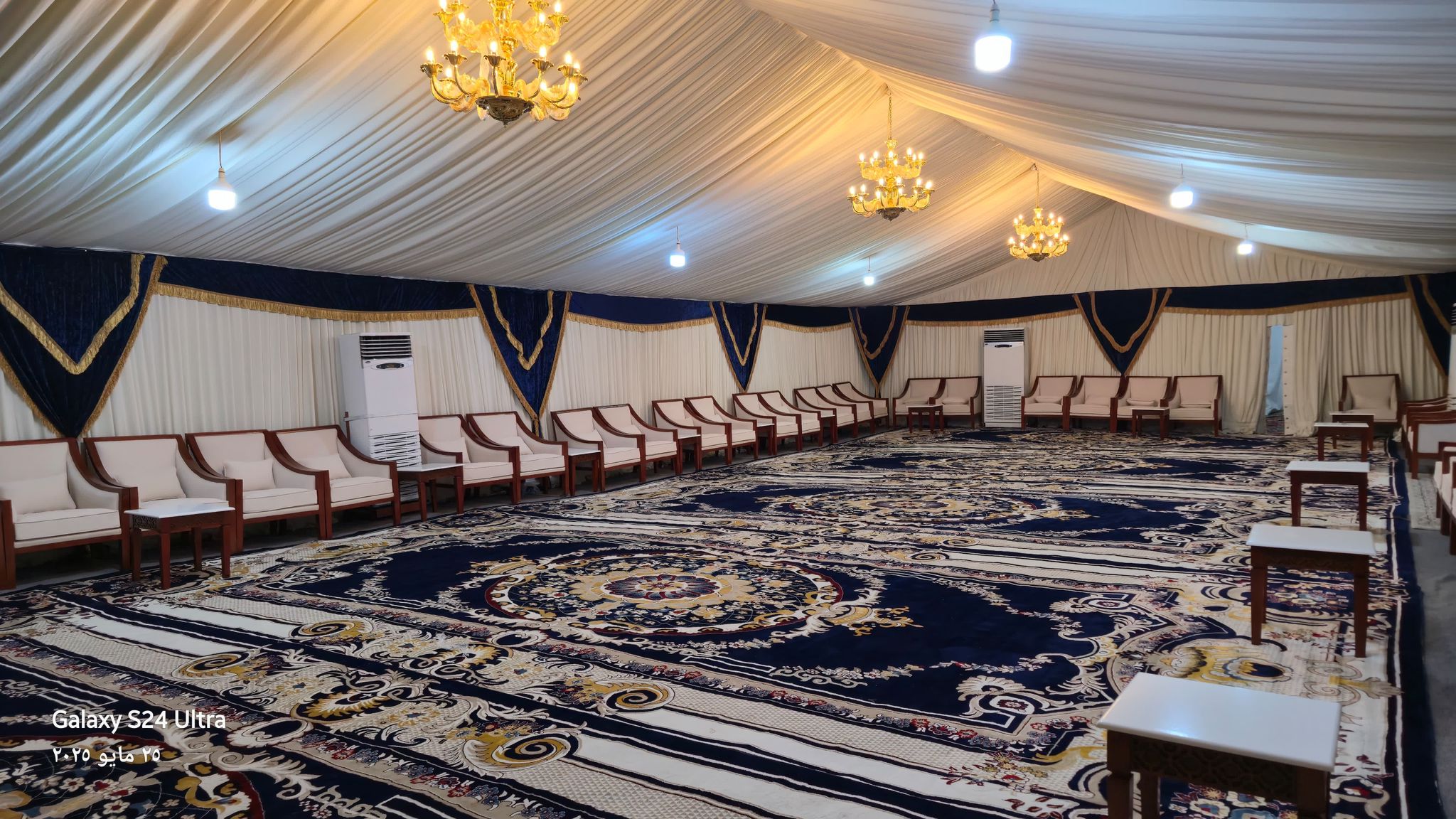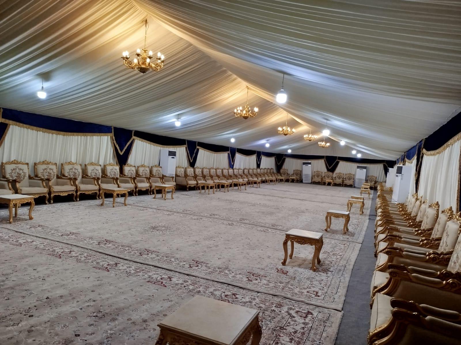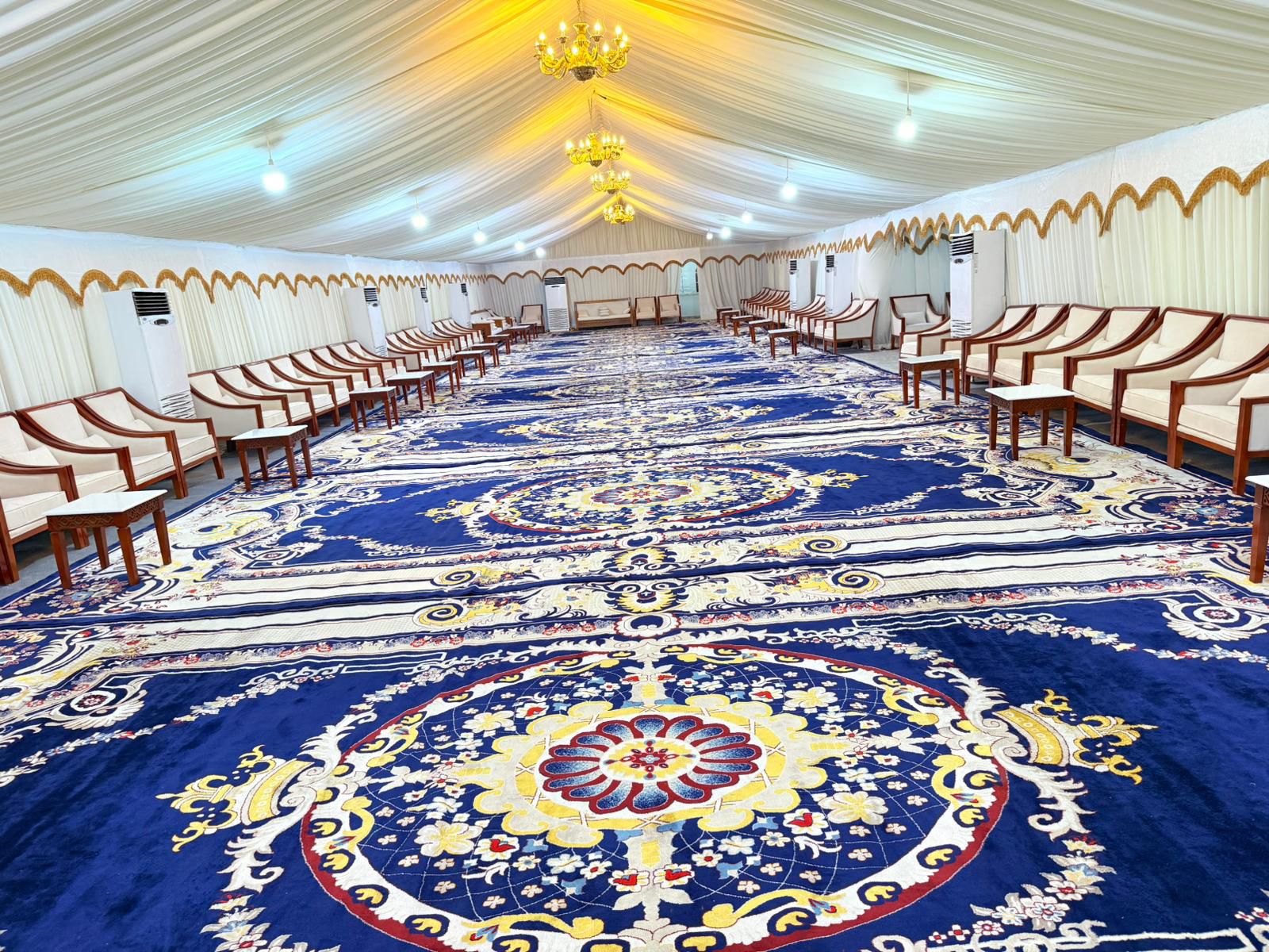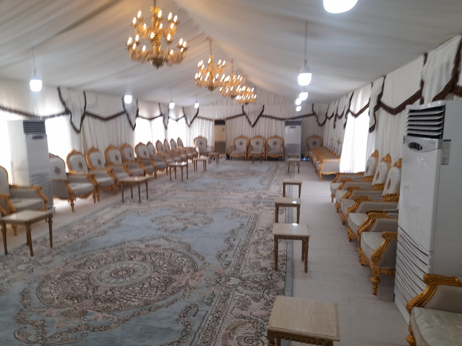 تشمل الخيام كافة التجهيزات اللازمة من مقاعد، طاولات، سجاد، مكيفات، لضمان راحة الضيوف.
