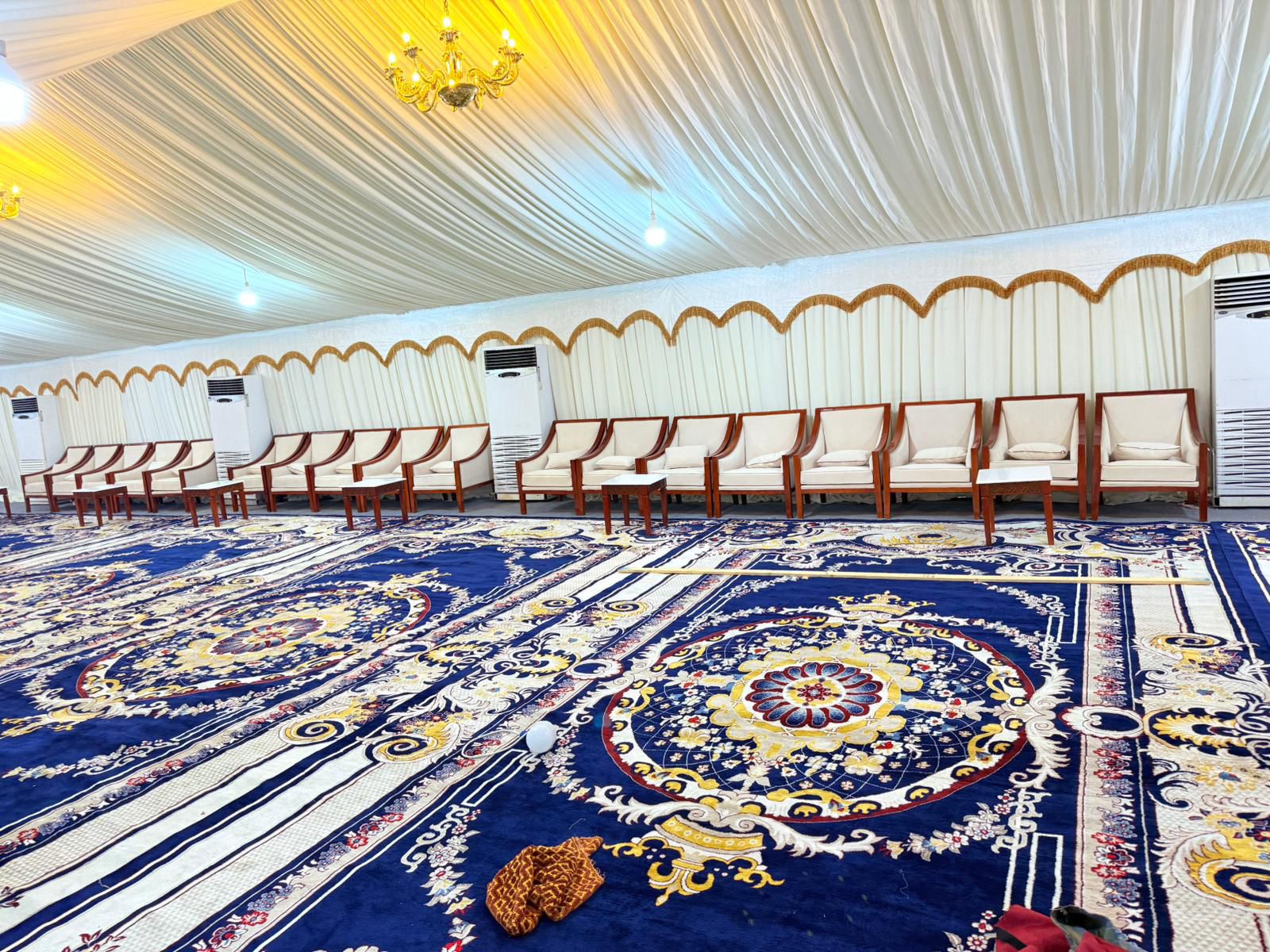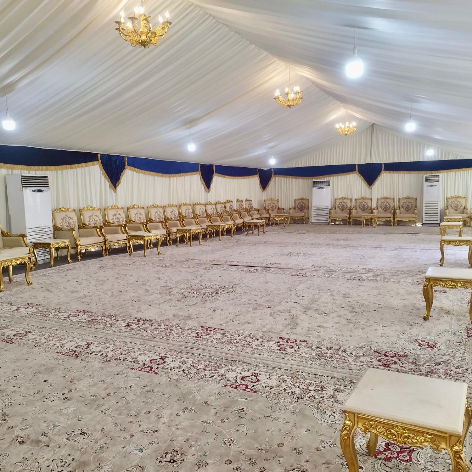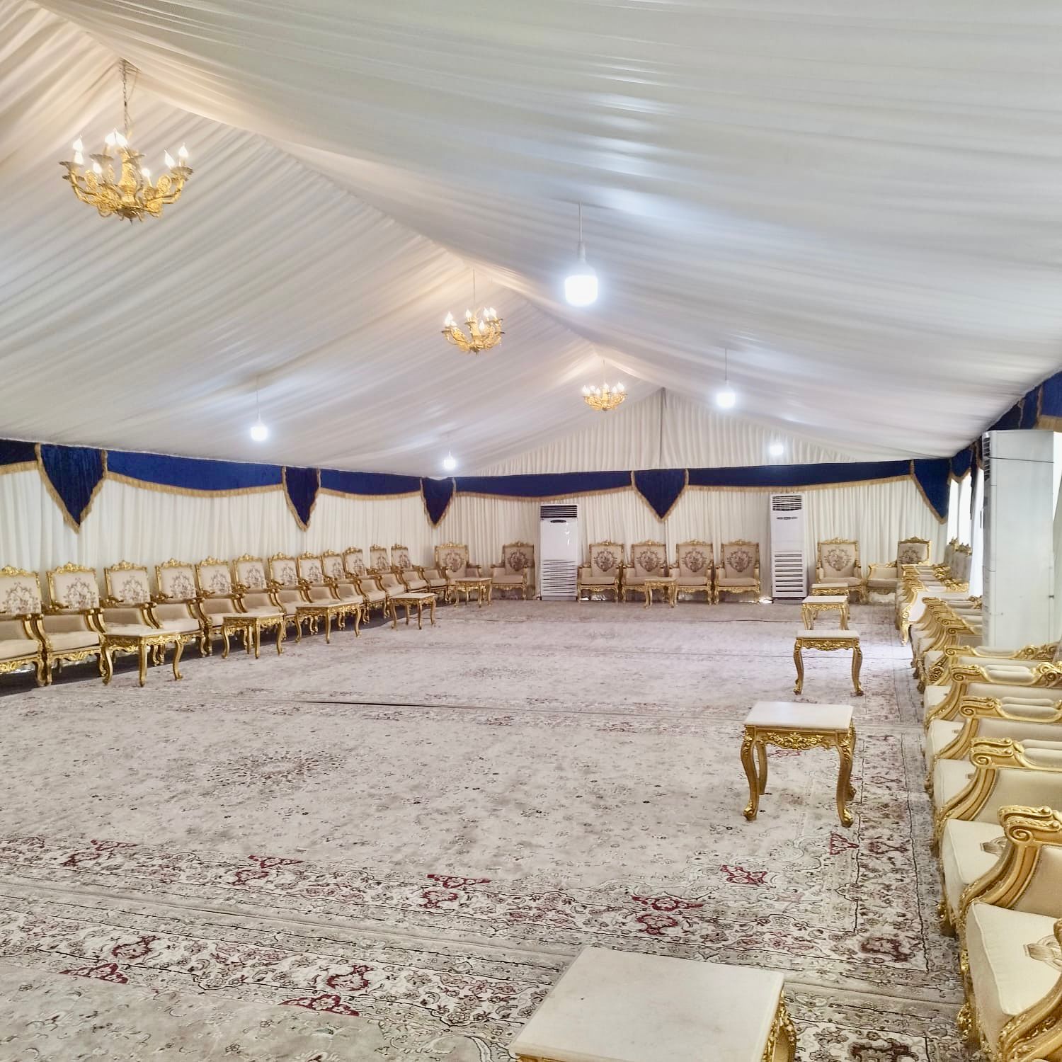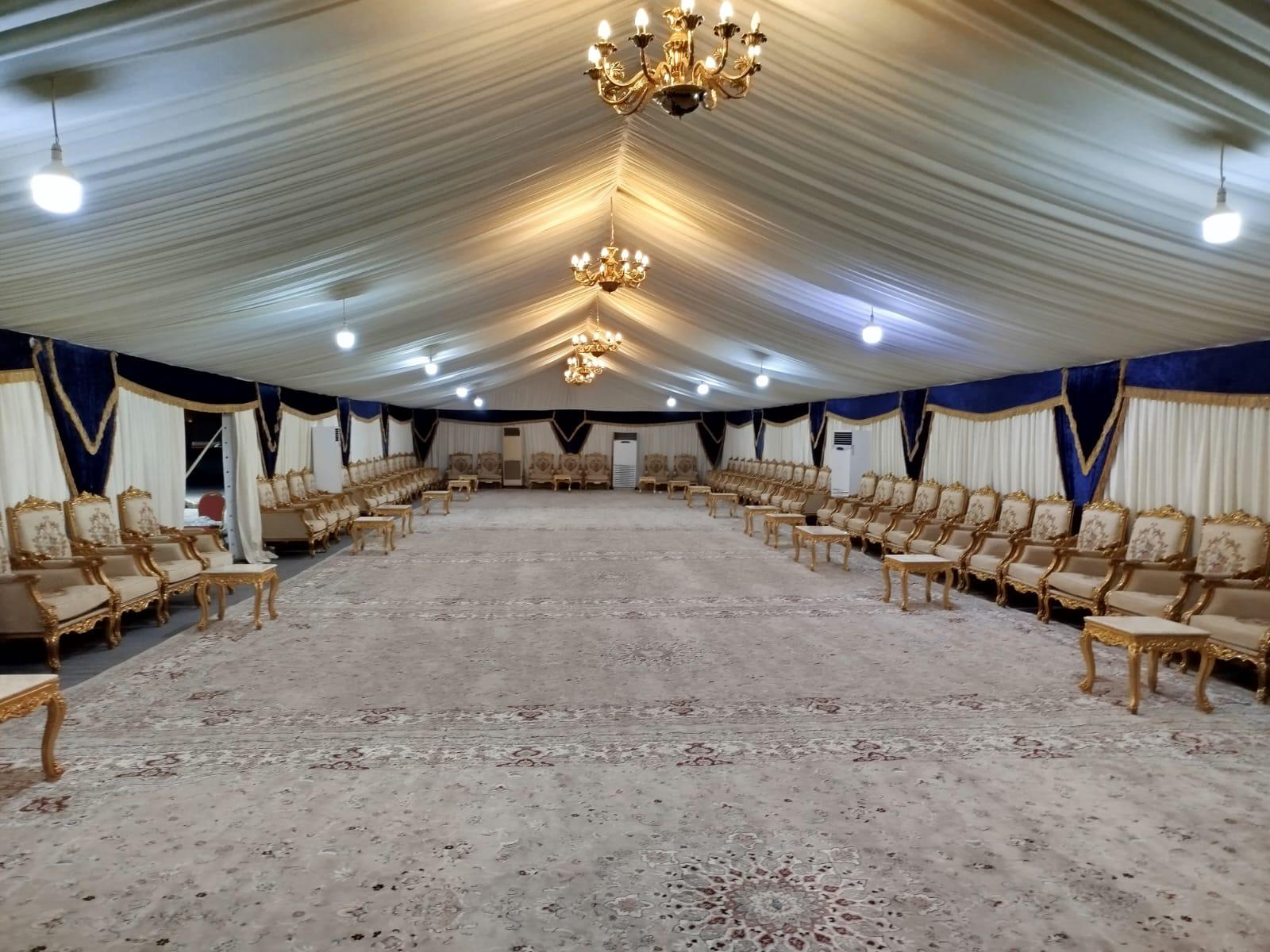 تشمل الخيام كافة التجهيزات اللازمة من مقاعد، طاولات، سجاد، مكيفات، لضمان راحة الضيوف.